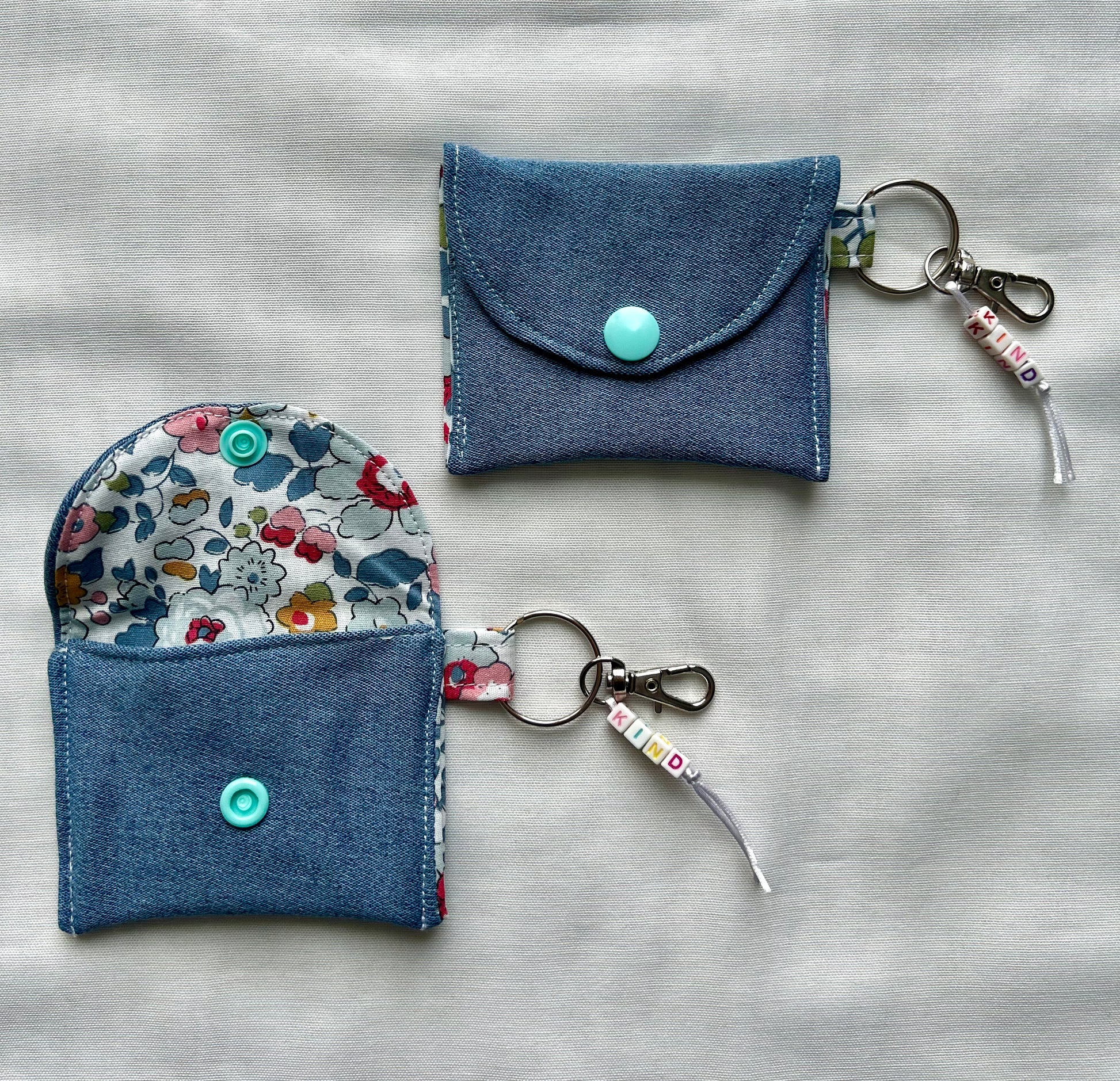 This handmade mini coin pouch is the perfect everyday accessory. Made with upcycled denim and a soft floral cotton lining, it’s designed to hold coins, folded bills, earbuds, or other small essentials.